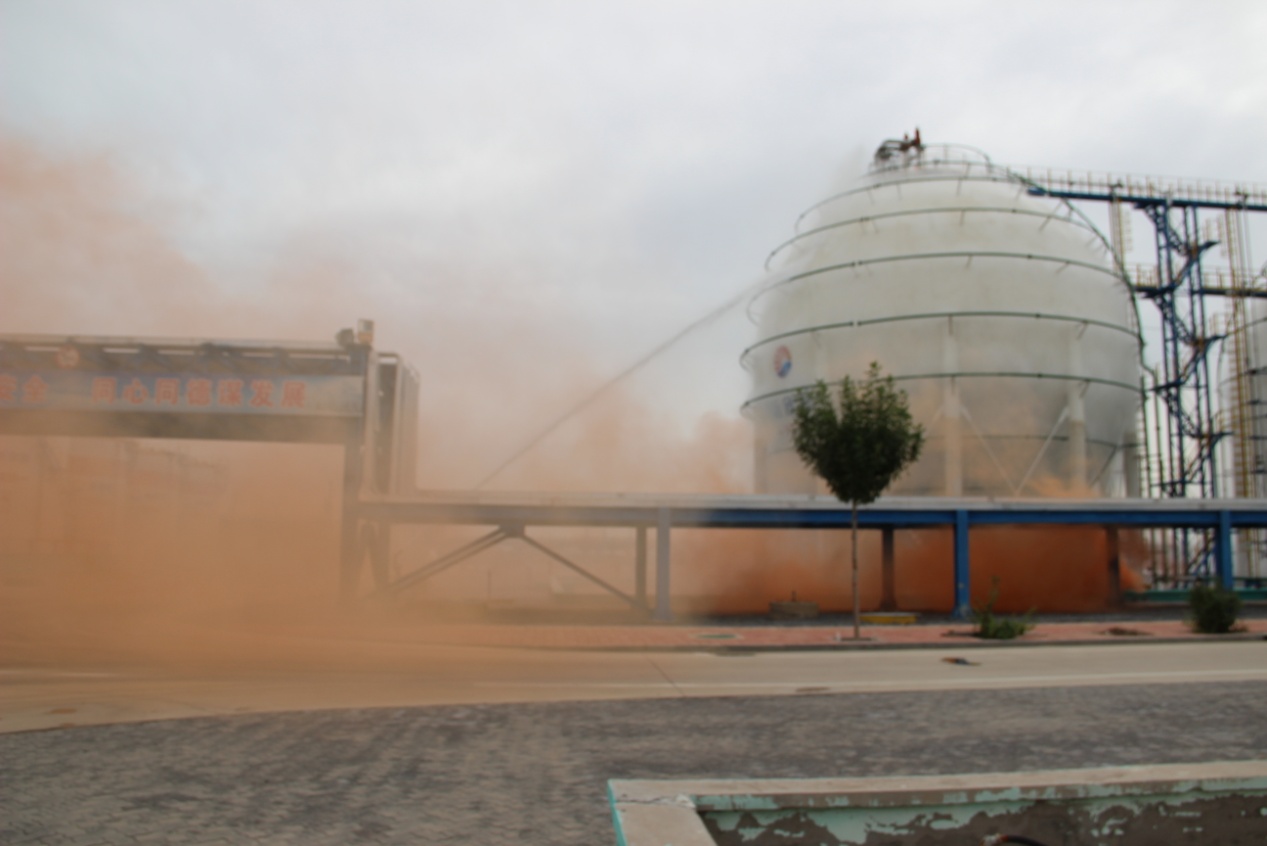 本次演練模擬丙烯球罐根部法蘭泄漏著火,通過采取現(xiàn)場消防應(yīng)急措施進行自救無法控制,請求政府支援。經(jīng)過現(xiàn)場緊急處置及企業(yè)消防隊、政府有關(guān)單位的支援,成功將火勢控制。