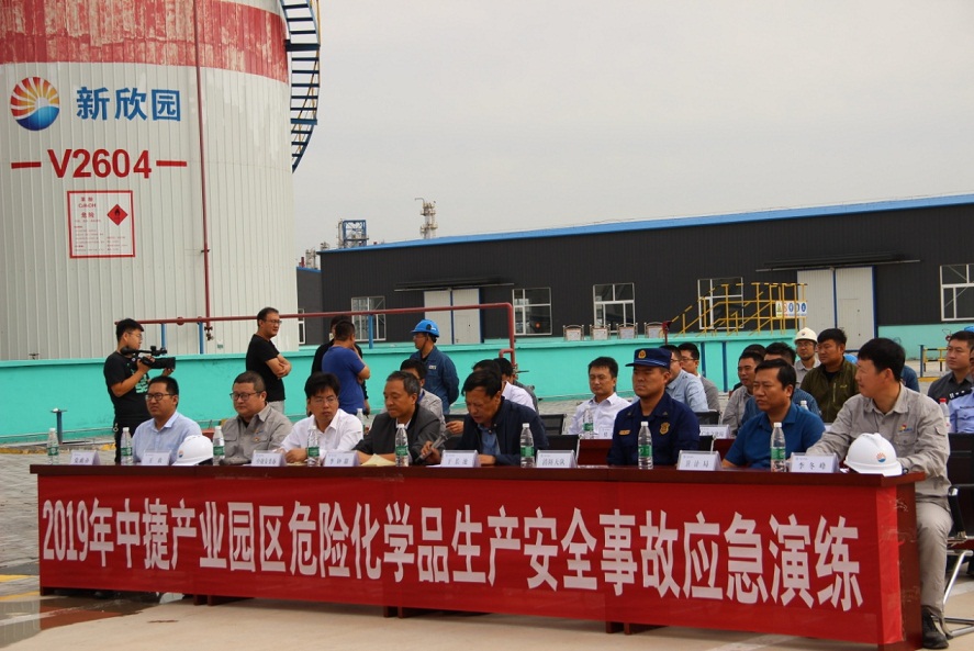 為提高園區(qū)應(yīng)急管理水平,檢驗企業(yè)應(yīng)急處置能力,評估完善企業(yè)和政府部門之間的應(yīng)急救援力量協(xié)同能力,9月19日上午,園區(qū)安委辦組織相關(guān)部門與新欣園公司共同開展2019年度全區(qū)危險化學(xué)品生產(chǎn)安全事故應(yīng)急救援演練。園區(qū)領(lǐng)導(dǎo)于長池、李鐘甜,新欣園公司總經(jīng)理王政、安全總監(jiān)李冬峰及相關(guān)政府部門代表出席活動,活動邀請中海油中捷石化、新啟元公司等10家危化企業(yè)代表觀摩學(xué)習(xí)了此次演練活動。
