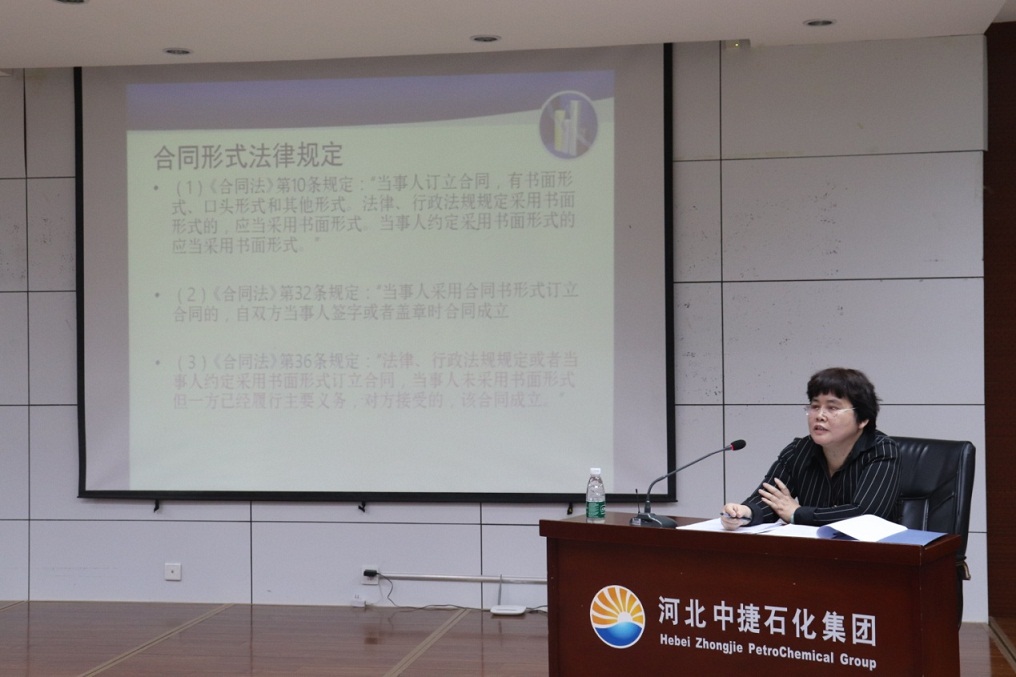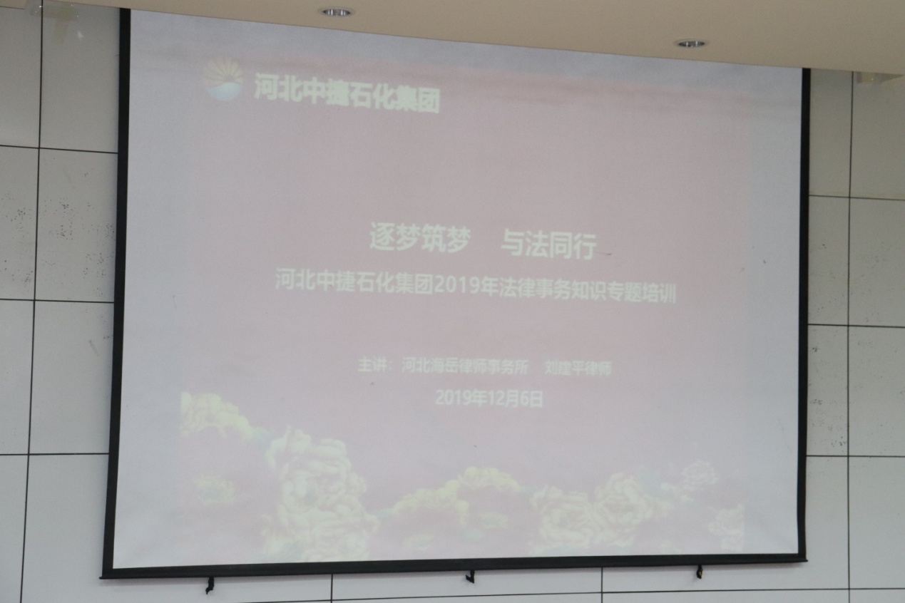 12月6日,集團(tuán)公司在科研樓六樓會(huì)議室組織開(kāi)展2019年“筑夢(mèng)逐夢(mèng)與法同行”法律事務(wù)知識(shí)專題培訓(xùn)活動(dòng),旨在深入貫徹落實(shí)集團(tuán)公司“學(xué)習(xí)是中捷石化園永不竣工的政治工程”的企業(yè)文化理念,提升集團(tuán)公司整體綜合管理水平,促進(jìn)公司依法經(jīng)營(yíng)、依法管理、依法參與市場(chǎng)競(jìng)爭(zhēng)、依法維護(hù)自身合法權(quán)益,為公司“持續(xù)、穩(wěn)定、創(chuàng)新、發(fā)展”營(yíng)造良好的法治環(huán)境。活動(dòng)特邀河北海岳律師事務(wù)所劉建平律師授課,集團(tuán)黨委書記于國(guó)臣、總經(jīng)理喬樹華、財(cái)務(wù)總監(jiān)宋立峰、總工程師李金馬,各單位董事長(zhǎng)、總經(jīng)理、副總經(jīng)理、總工、副總工、財(cái)務(wù)經(jīng)理,相關(guān)采購(gòu)、銷售、合同管理部門經(jīng)理及主辦人員共計(jì)64人參加,集團(tuán)審計(jì)部經(jīng)理王力軍主持本次活動(dòng)。