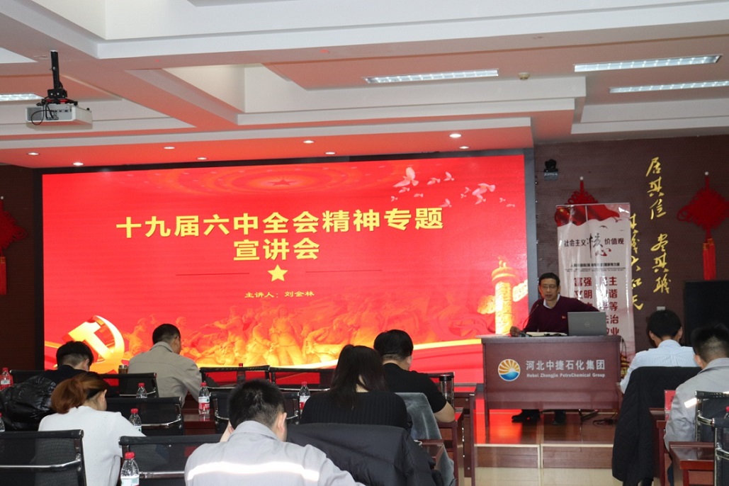 集團公司訊 12月10日上午,河北中捷石化集團黨委在科研樓六樓會議室組織舉辦了黨的十九屆六中全會精神專題宣講會,集團黨委書記于國臣,黨委副書記、紀委書記朱振江等集團領導,各黨(總)支部書記、黨員代表共計40余人參加。宣講會特邀中捷產業(yè)園區(qū)宣傳部副部長劉金林主講。