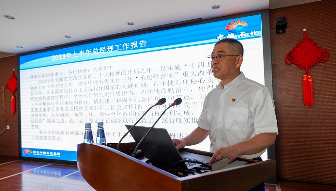 集團(tuán)公司訊 7月16日上午,河北中捷石化集團(tuán)2023年上半年工作會(huì)議在新啟元科研樓六樓會(huì)議室召開,集團(tuán)公司董事長(zhǎng)王振華,黨委書記于國(guó)臣,總經(jīng)理喬樹華,以及集團(tuán)公司各主管領(lǐng)導(dǎo),各所屬單位管理人員共計(jì)70余人參加了此次會(huì)議。會(huì)議由集團(tuán)黨委書記于國(guó)臣主持。