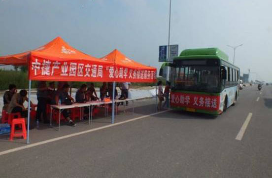 此次活動我公司共出動公交車2輛,出租車20輛,并且有運政、路政共10名執(zhí)法人員參加,公交車和出租車的LED屏上顯示著醒目的“愛心助學,義務接送”信息,并在黃驊汽車站設立了專門的服務臺和工作人員,引導遠道而來的家長和新生免費乘車。工作人員幫新生提行李、引路,及時將新生和家長送到早已等候的班車,然后一站式送達至學校。此次義務接送農(nóng)大新生入學活動,得到廣大新生和家長們一致好評。